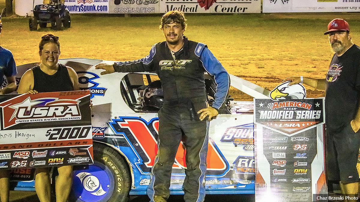 By USRA (Vivian, LA) -- Veteran short track ace Chris Henigan used a thrilling last-lap pass to secure a $2,000 payday, winning a 30-lap A Main for the USRA American Racer Modified Series presented by DAY Motor Sports on Saturday at the Ark-La-Tex Speedway.